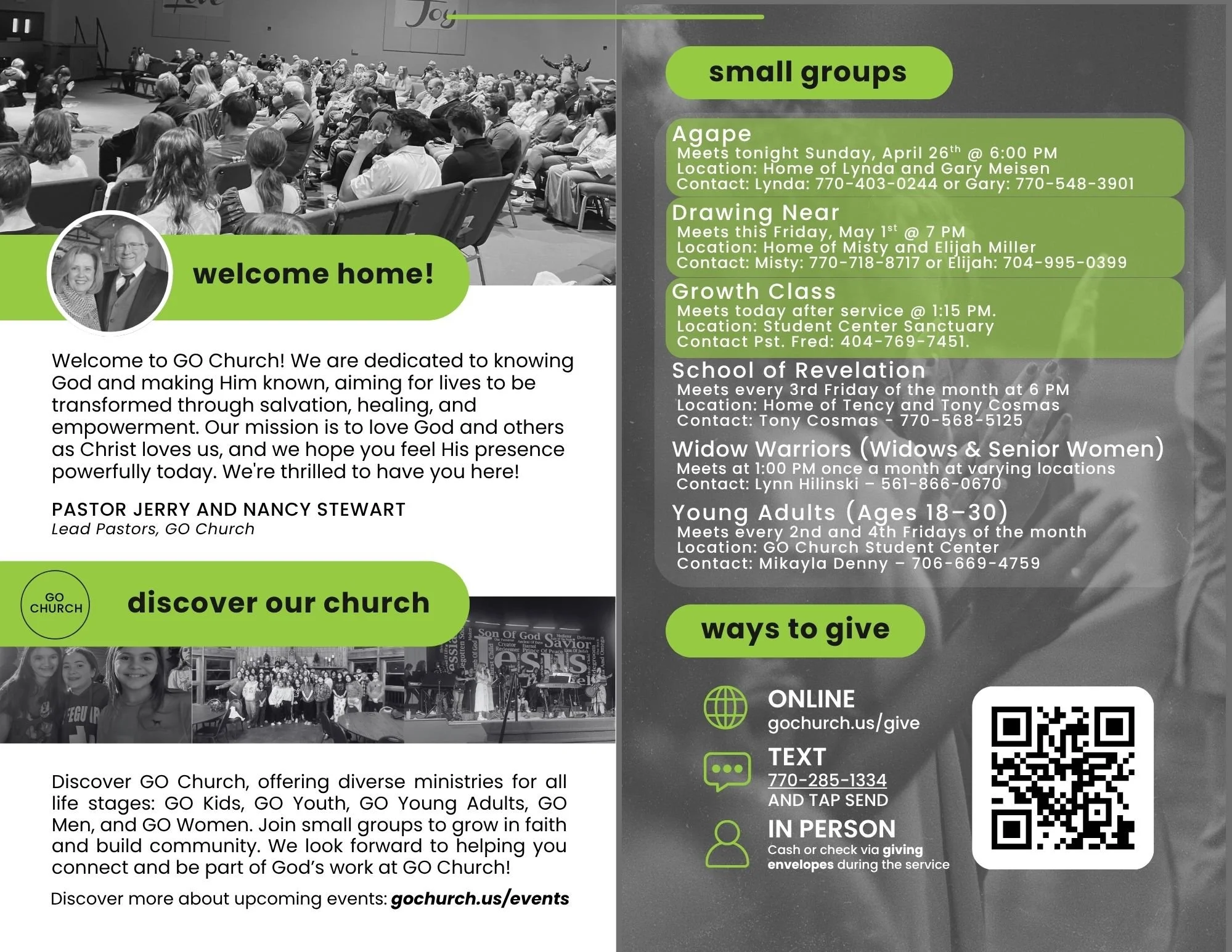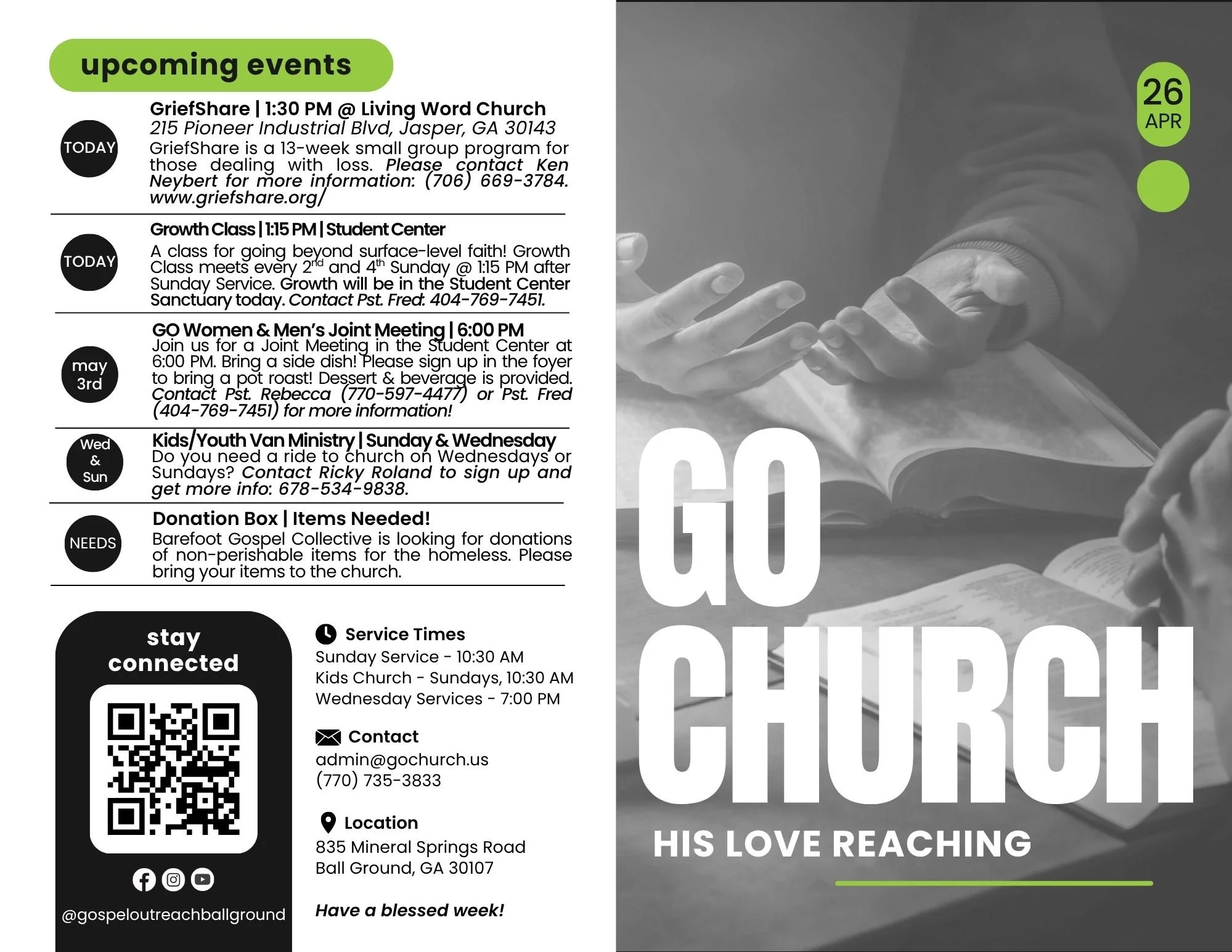 At GO Church, we value community and staying connected. Stay informed with the latest updates through our social media, emails, and website. Discover opportunities to serve and make a difference. Be the first to know about events, services, and guest speakers. Stay connected and make a positive impact in our world for Jesus!